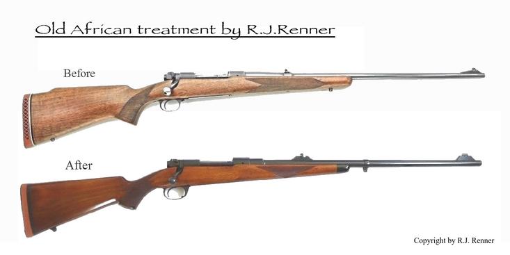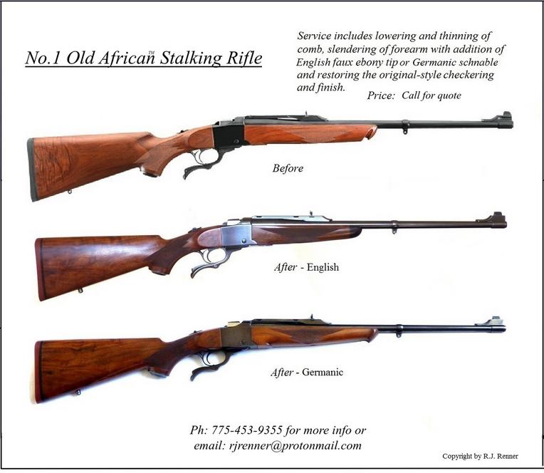 Mauser System rifles are the basis for our Old AfricanTM Rifle, although I also provide that Old African look and feel to Ruger No.1s as well. We begin with your Mark X Mauser, Model 70 Win, CZ / BRNO or Ruger M-77 or Ruger No.1 rifle stock and slenderize it, opening the grip, reducing the forearm length while slenderizing it and then adding a faux ebony forearm tip.